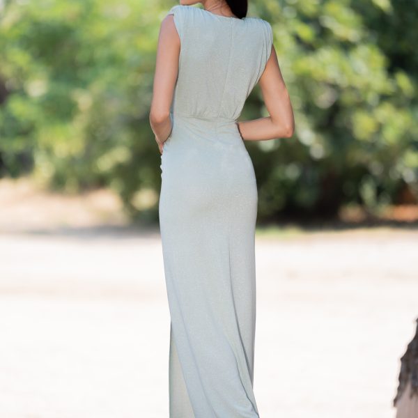 Vestido largo de punto lurex drapeado cuello pico con hombreras