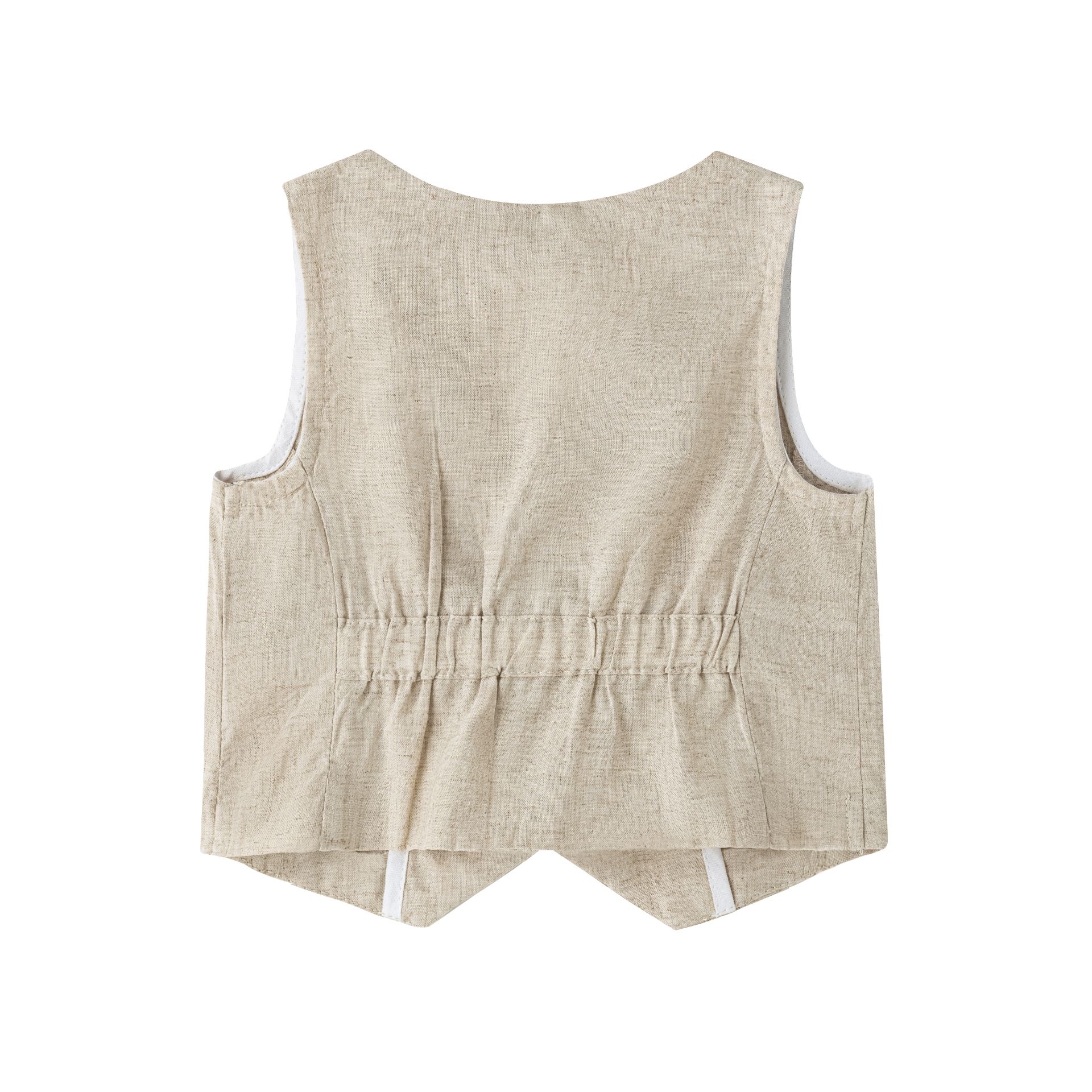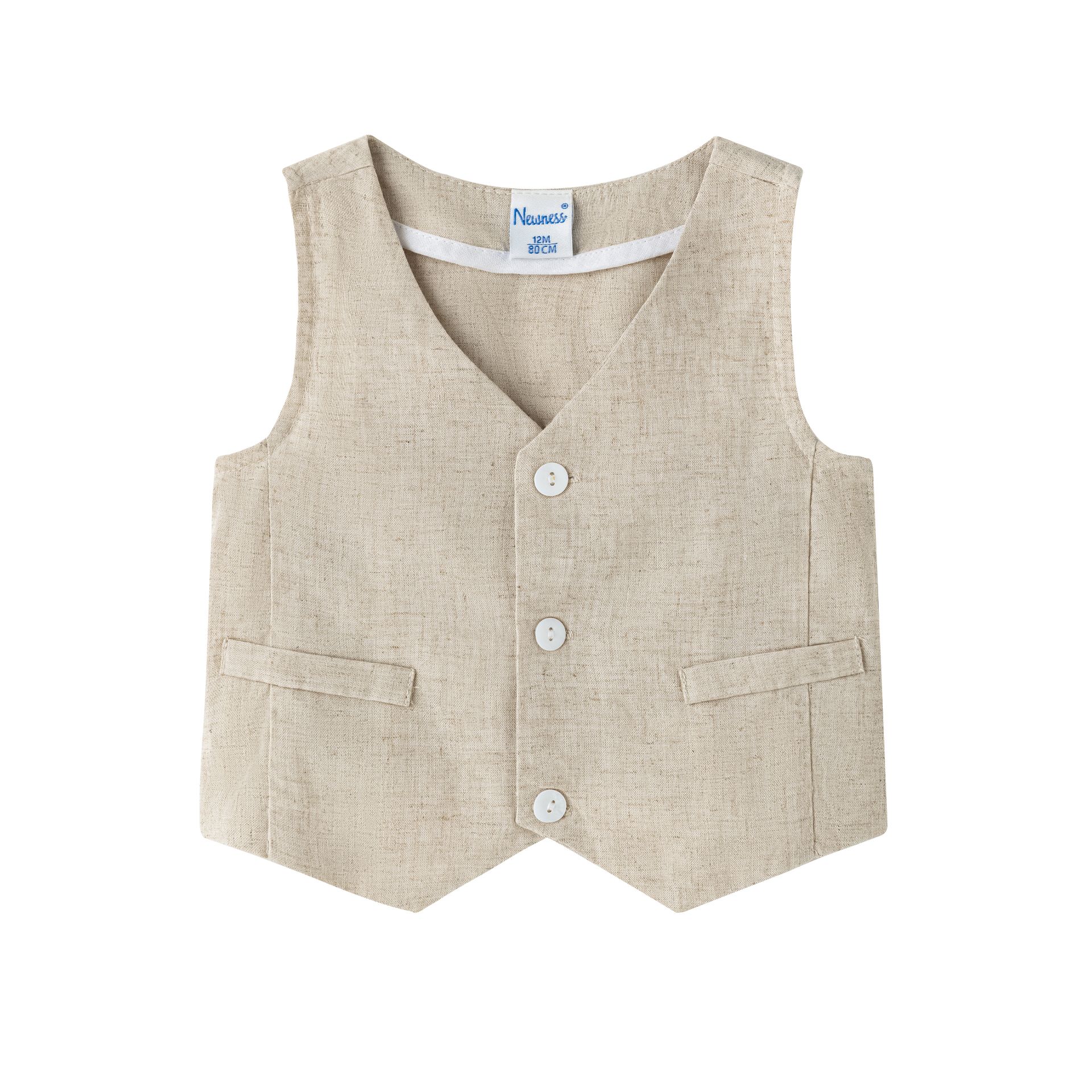 Chaleco de bebé niño, con cuello pico en tejido de mezcla de lino y algodón color camel. Cierre con botones de nácar en la parte delantera de la prenda.