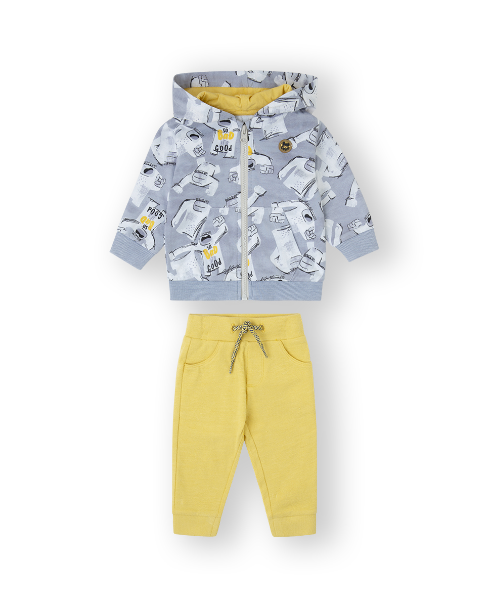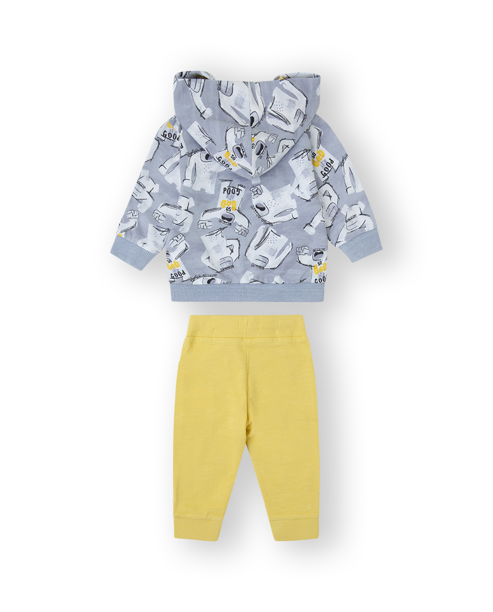 Conjunto chandal bebé, sudadera gris con dibujos y pantalón color mostaza.