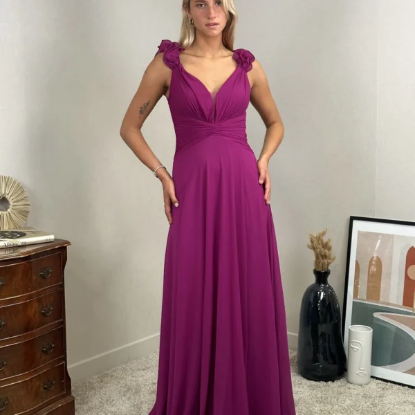 VESTIDO LARGO DRAPEADO CON VOLANTE EN EL HOMBRO