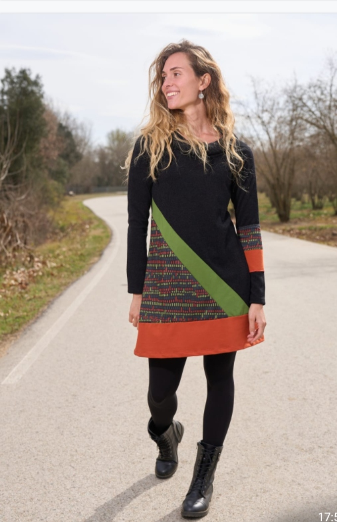 Vestido cálido lateral estampado verde oliva teja + 1 manga + lateral oliva + franja abajo en teja.