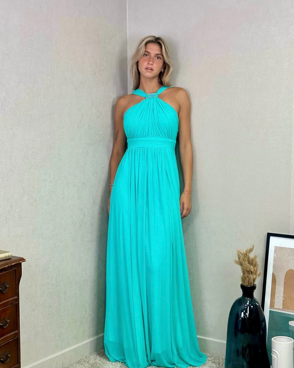 VESTIDO LARGO CON ADORNO CENTRAL