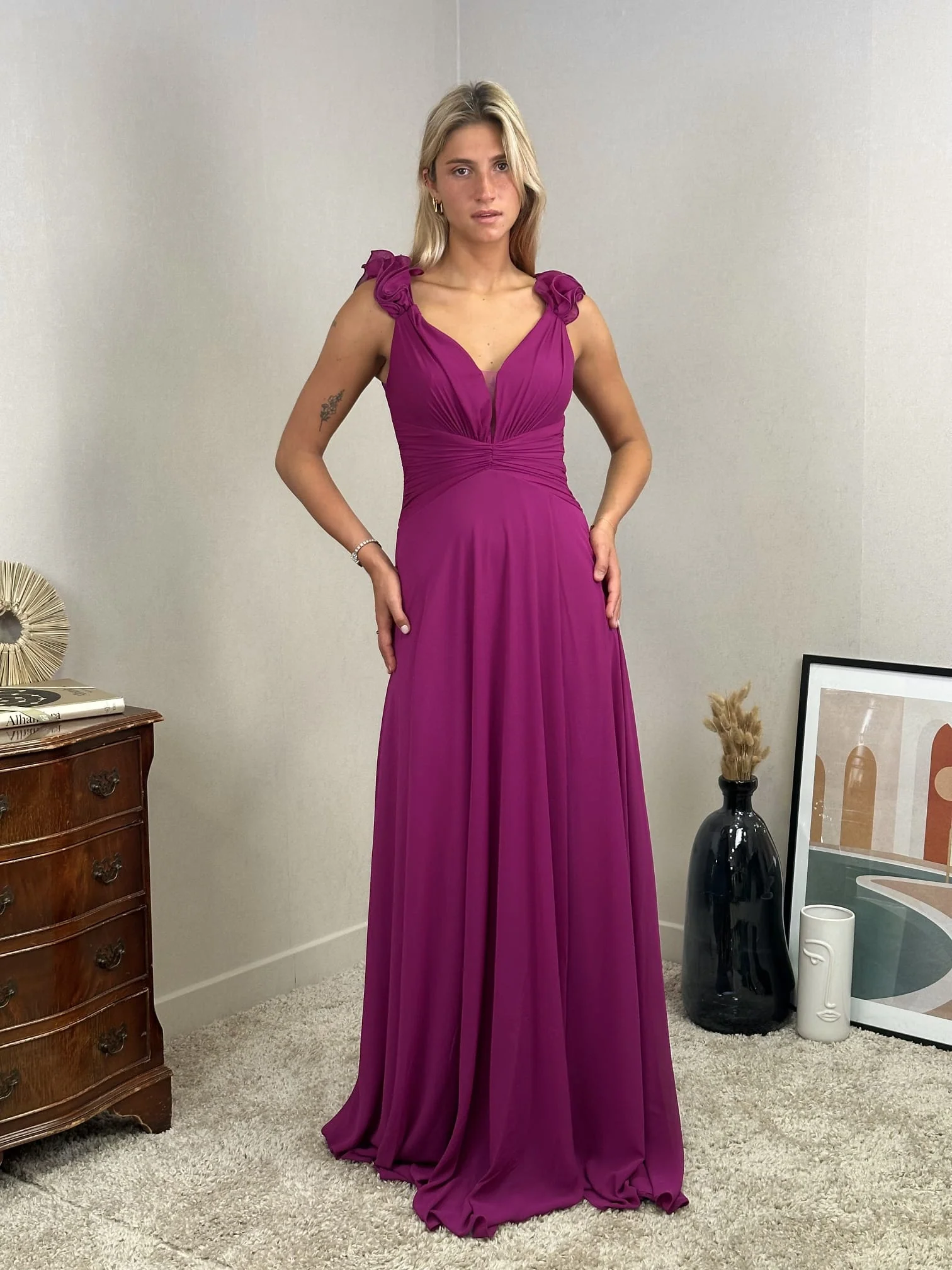 VESTIDO LARGO DRAPEADO CON VOLANTE EN EL HOMBRO