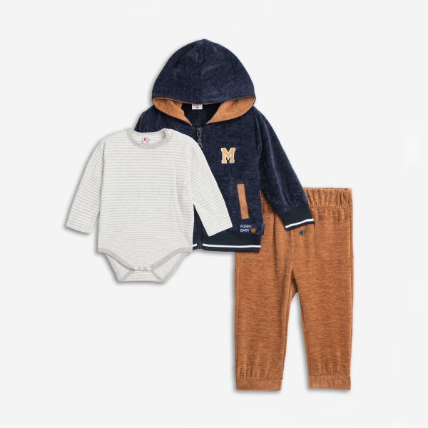 Conjunto 3 piezas chaqueta con capucha, ropa interior manga larga con rayas estampadas y pantalón para recién nacido niño 0-24 meses en color azul/crudo/miel