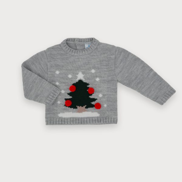 Jersey gris con adorno navideño  árbol en verde con pompón en rojo.