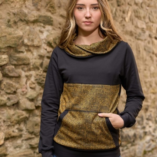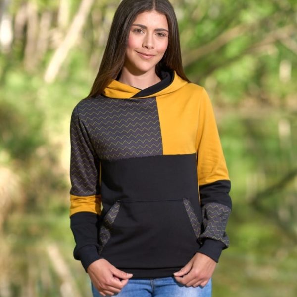Sudadera con el cuello cruzado + base + bolsillos estampado  amarillo . Fabricación artesanal