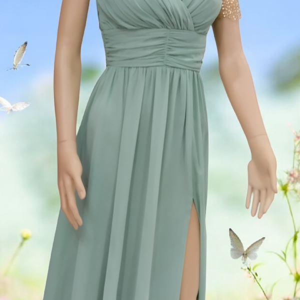 Vestido asimétrico largo . Apertura en la cadera y un hombro al descubierto. Apertura lateral .